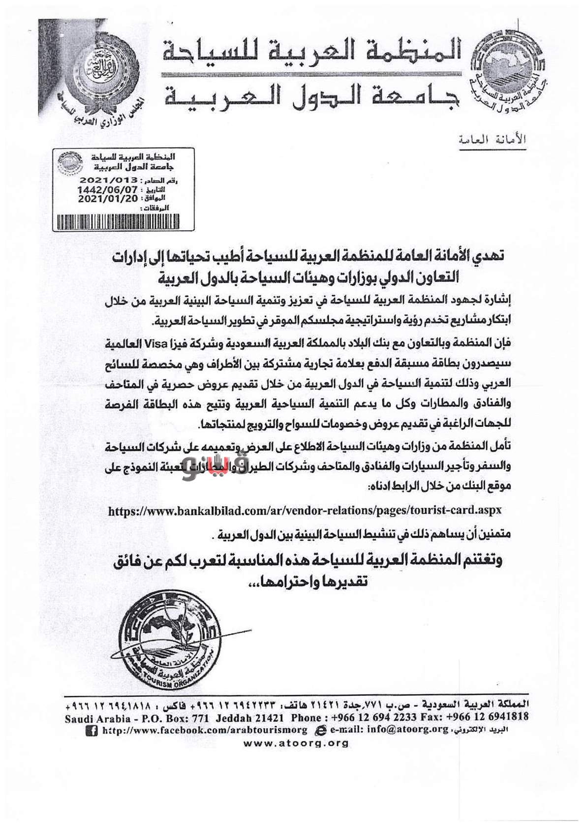 تدرس وزارة السياحة والآثار مقترح المنظمة العربية للسياحة بإصدار بطاقات السحب النقدي «فيزا» مخصصة للسائح العربي بعلامة تجارية توفر خصومات وعروض في المتاحف والفنادق والمطارات للسائحين.