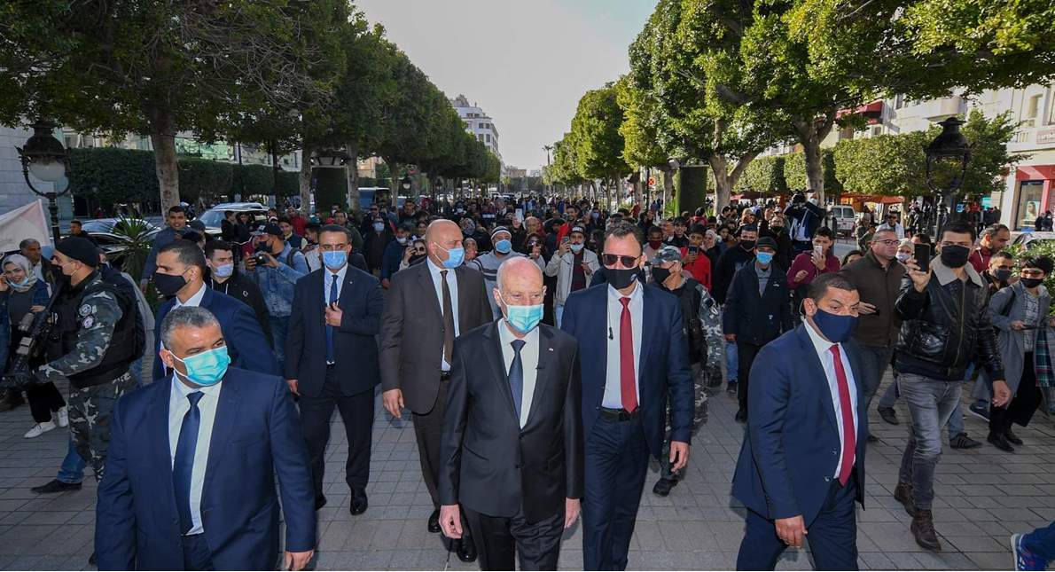 ظهر الرئيس التونسي قيس سعيد مساء اليوم الثلاثاء، وهو يجوب شارع بورقيبة وسط العاصمة تونس في جولة غير معلنة مسبقا.