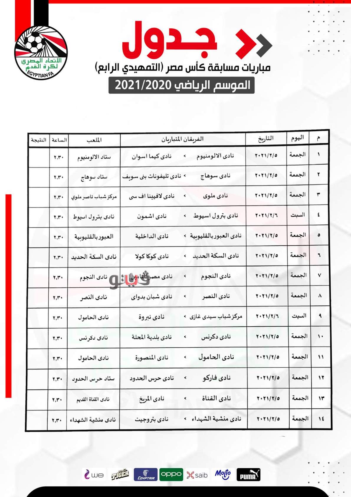 جدول مباريات الدور التأهيلي الرابع لمسابقة كأس مصر
