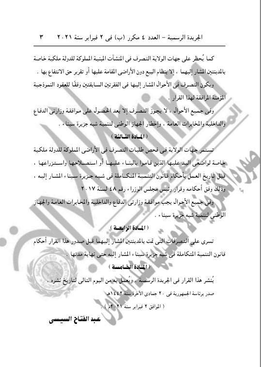 أصدر الرئيس عبد الفتاح السيسي قرار رقم 28 لسنة2021 باستثناء مدينتي شرم الشيخ ودهب بمحافظة جنوب سيناء من نطاق تطبيق أحكام قانون التنمية المتكاملة فى شبه جزيرة سيناء بشكل جزئي.
