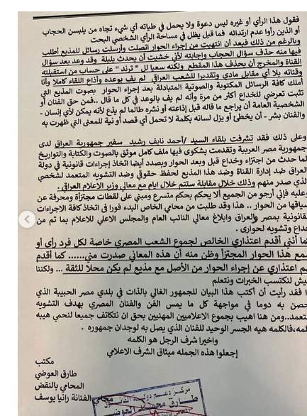 وكانت رانيا يوسف أصدرت بيانا منذ قليل، أعلنت من خلاله مقاضاة نزار الفارش، والتقاءها بالسفير العراقي في مصر، قائلة: «تشرفت بلقاء السيد/ أحمد نايف رشيد سفير جمهورية العراق لدى جمهورية مصر العربية، وتقدمت بشكوى فيها ملف كامل موثق بالصوت والكتابة والتواريخ لما حدث من اجتزاء وخداع قبل وبعد الحوار، وبصدد أيضا اتخاذ الإجراءات القانونية في دولة العراق، ضد إدارة القناة وضد هذا المذيع، لحفظ حقوقي وضد التشوية المتعمد لشخصي، الذي صدر منهم، وذلك خلال مقابلة ستتم خلال أيام مع وزير الإعلام العراقي».