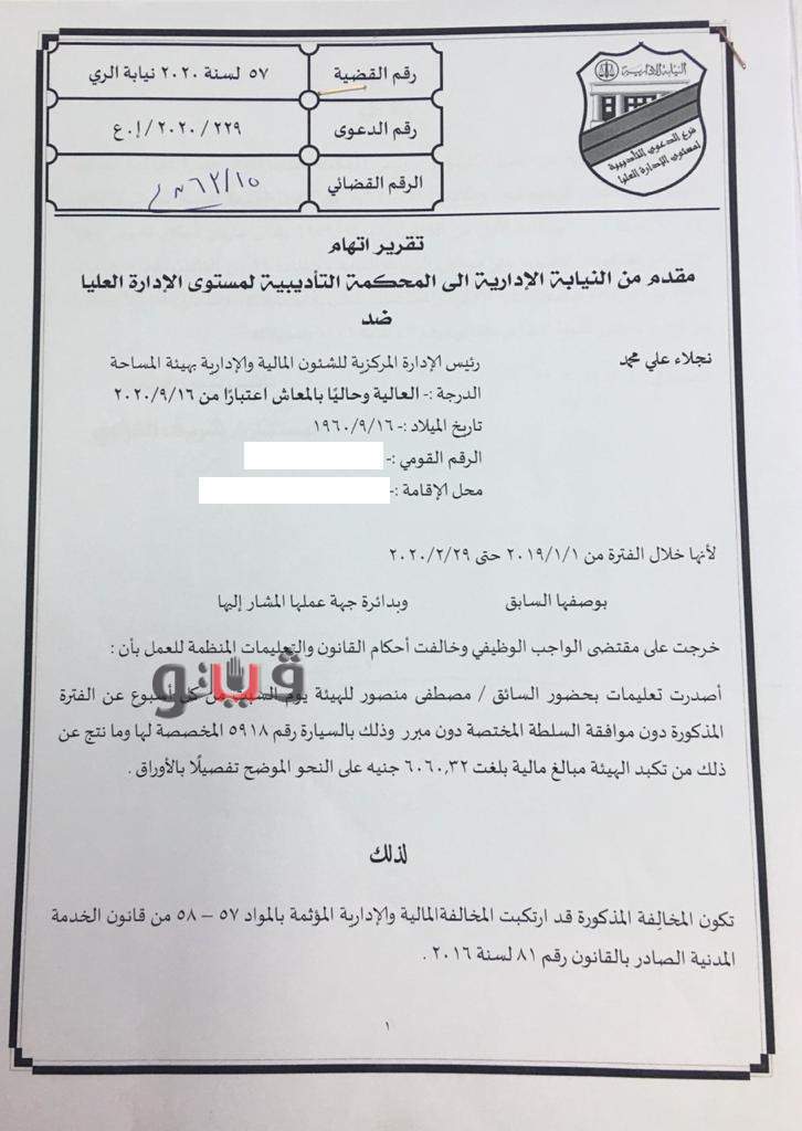 وتبين من أوراق القضية أن المحالة أصدرت تعليمات بحضور السائق مصطفى منصور للهيئة جهة عملها بالسيارة المخصصة لها رقم 5918 يوم السبت من كل إسبوع لمدة 14 شهر دون موافقة السلطة المختصة دون مبرر مما نتج عن ذلك تكبد هيئة المساحة مبالغ مالية