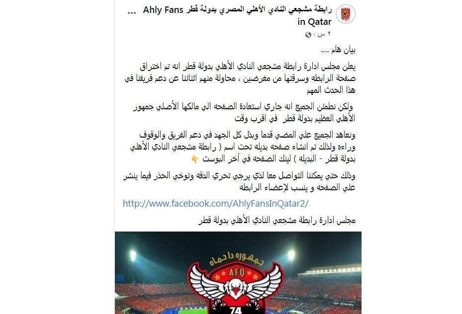 ومن جانبها أصدرت الرابطة بيانًا عاجلًا قالت فيه: "يعلن مجلس إدارة رابطة مشجعي النادي الأهلي بدولة قطر أنه تم اختراق صفحة الرابطة وسرقتها من مغرضين، محاولةً منهم إثناءنا عن دعم فريقنا في هذا الحدث المهم".
