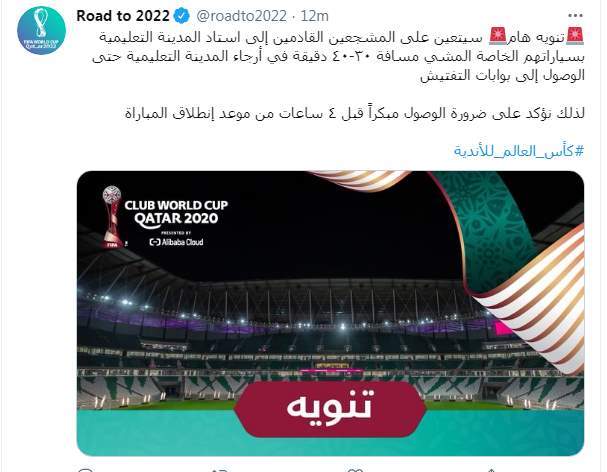 وكتبت لجنة مشاريع وإرث بطولة كأس العالم عبر تويتر " تنويه هام.. سيتعين على المشجعين القادمين إلى استاد المدينة التعليمية بسياراتهم الخاصة المشي مسافة ٣٠-٤٠ دقيقة في أرجاء المدينة التعليمية حتى الوصول إلى بوابات التفتيش"