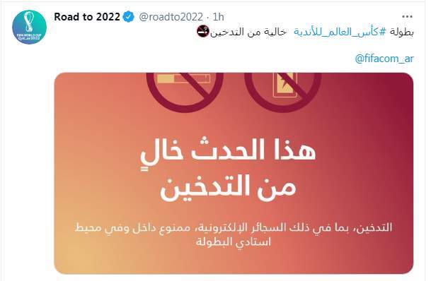 وقالت اللجنة " مباريات #كأس_العالم_للأندية خالية من التدخين. سيتم مصادرة الولاعات وعلب السجائر والسجائر الإلكترونية وأعواد الكبريت بجميع أنواعها من المشجعين نرجو منكم عدم إحضار أي من الأغراض المذكورة في القائمة إلى الاستادات"