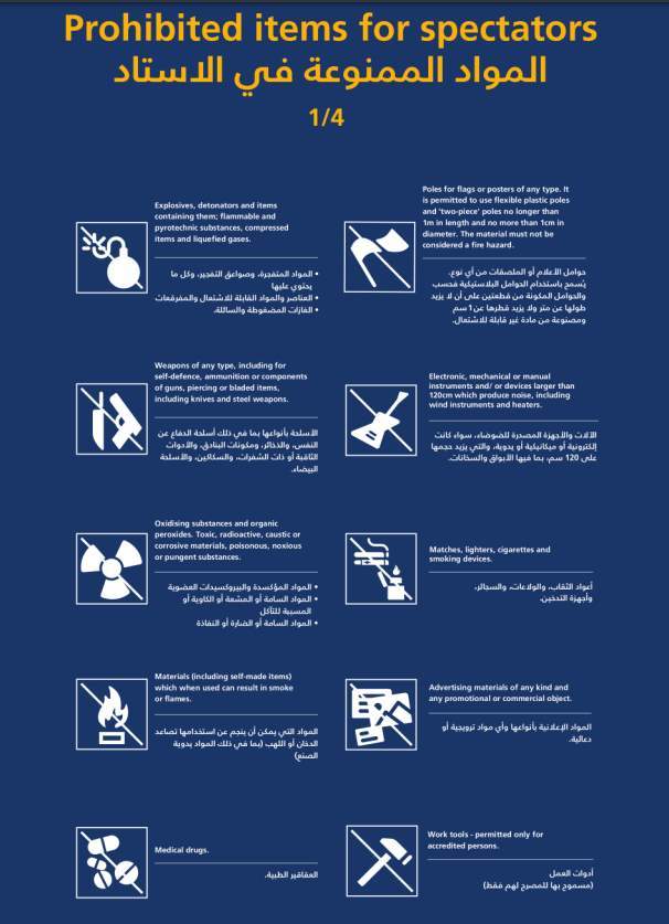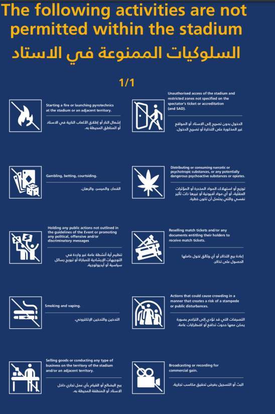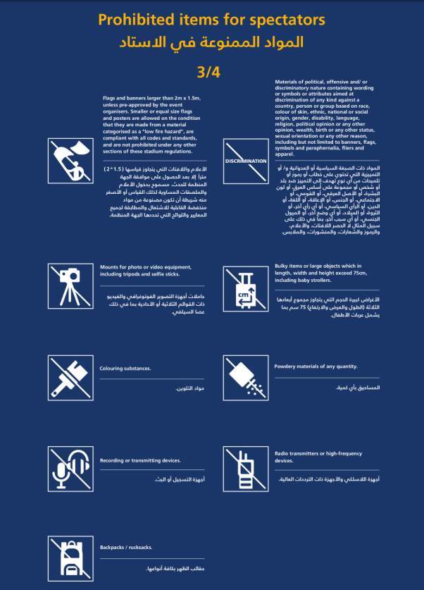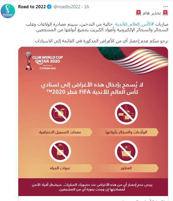 أطلق "الطريق لـ22"، الحساب الرسمي للجنة مشاريع وإرث بطولة كأس العالم FIFA قطر 2022، عدد من التنبيهات والمحظورات التي يتعين على مشجعي بطولة كأس العالم للأندية اتباعها.