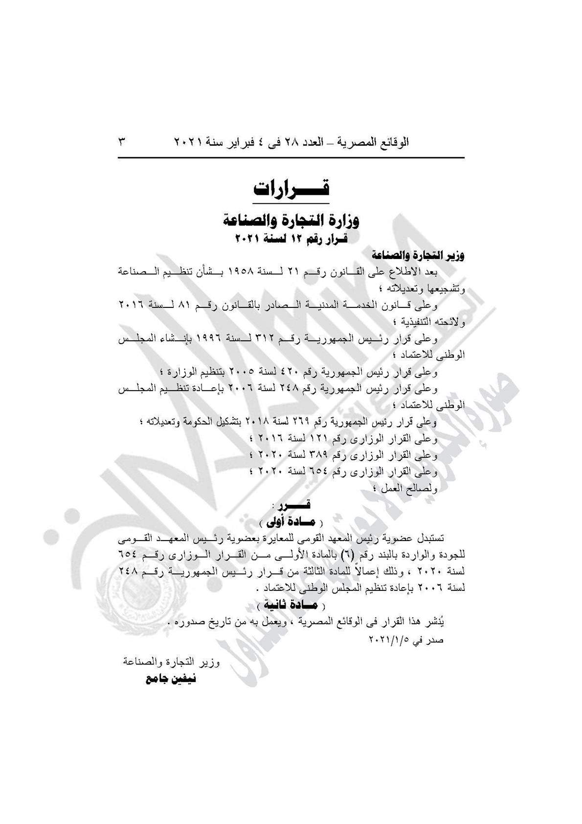 نشرت جريدة الوقائع المصرية في عددها رقم 28، الصادر في 4 فبراير 2021، قرار وزارة التجارة والصناعة رقم 12 لسنة 2021، بشأن استبدال عضوية رئيس المعهد القومي للمعايرة بعضوية رئيس المعهد القومي للجودة بالمجلس الوطني للاعتماد.