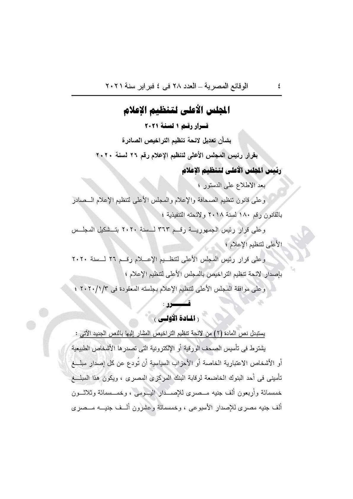 نشرت جريدة الوقائع المصرية في عددها رقم 28، الصادر في 4 فبراير 2021، قرار المجلس الأعلى لتنظيم الإعلام رقم 1 لسنة 2021، بشأن تعديل لائحة تنظيم التراخيص الصادرة بقرار رئيس المجلس الأعلى لتنظيم الإعلام رقم 26 لسنة 2020.