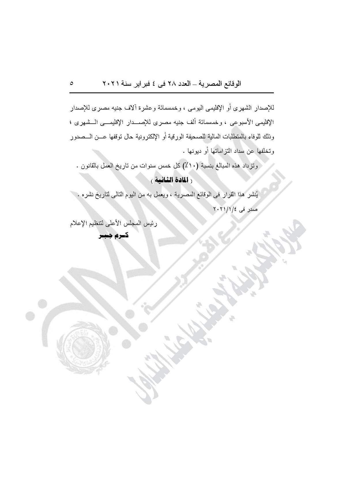 "ويكون هذا المبلغ 540 ألف جنيهًا مصريًا للإصدار اليومي، و530 ألف جنيهًا مصريًا للإصدار الأسبوعي، و520 ألف جنيهًا مصريًا للإصدار الشهري أو الإقليمي اليومي، و510 ألف جنيهًا مصريًا للإصدار الإقليمي الأسبوعي، و500 ألف جنيهًا مصريًا للإقليمي الشهري.. وتزداد المبالغ بنسبة 10% كل 5 سنوات من تاريخ العمل بالقانون"