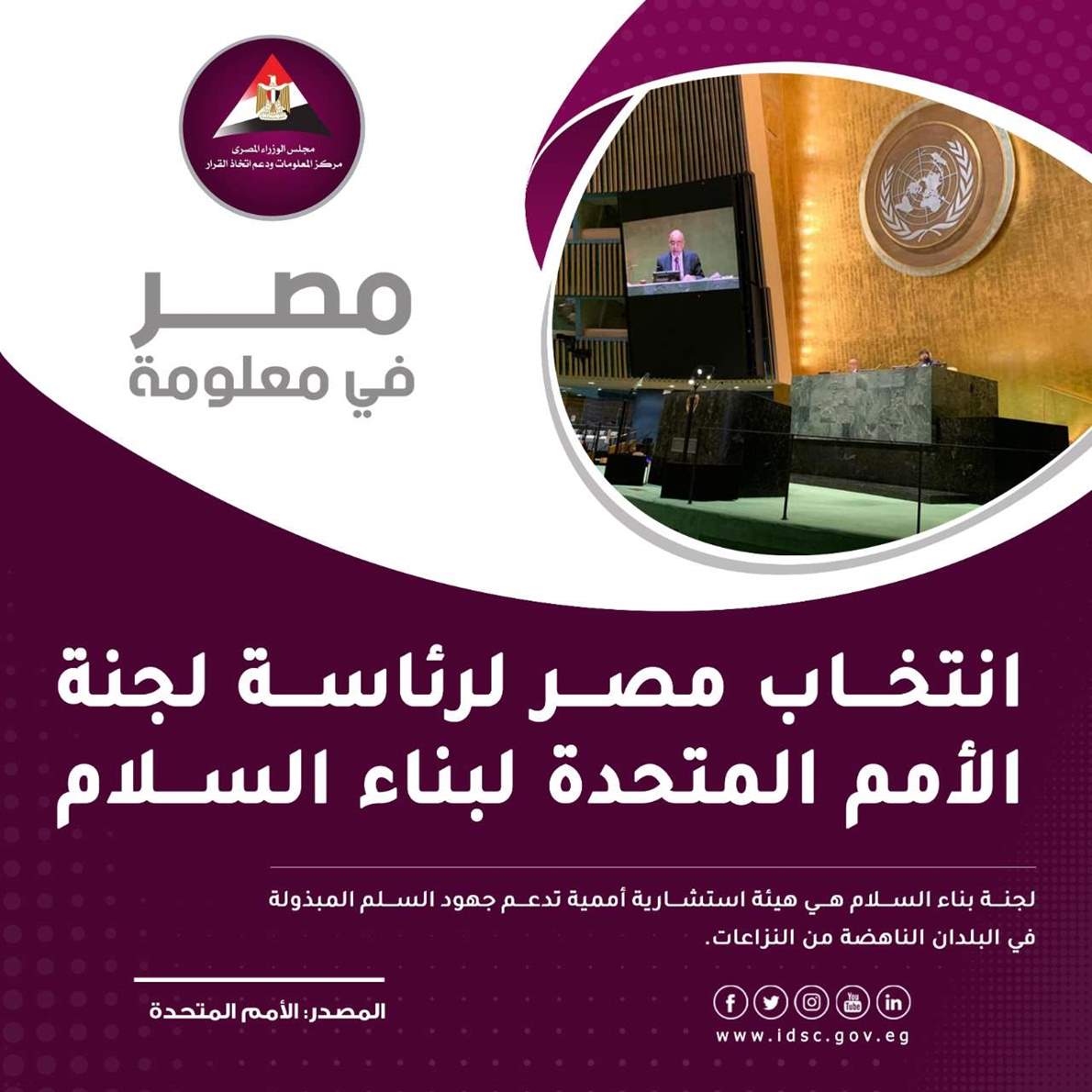 نشر مركز معلومات مجلس الوزراء إصدار جديد من سلسلة "مصر في معلومة" حول انتخاب مصر لرئاسة لجنة الأمم المتحدة لبناء السلام.