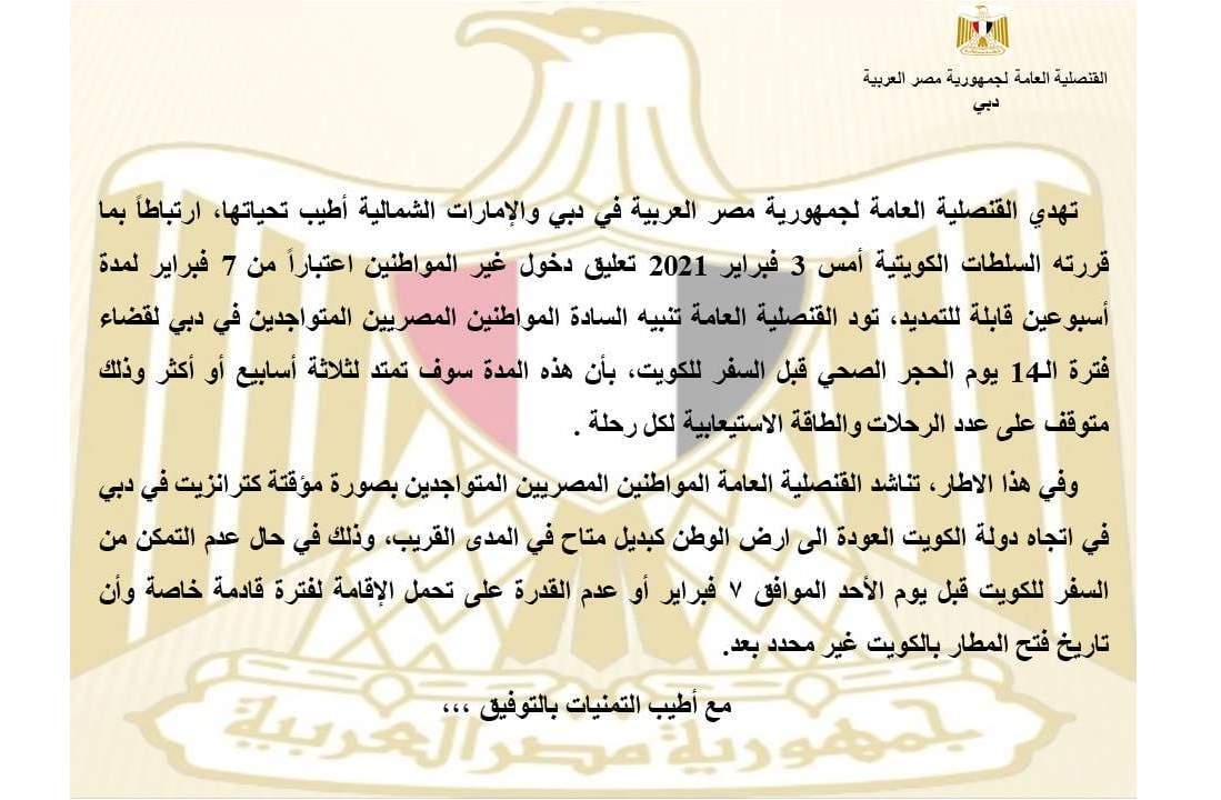 ناشدت القنصلية العامة لجمهورية مصر العربية في دبي، المصريين المتواجدين بصورة مؤقتة كترانزيت في الإمارات، والمتجهين إلى دولة الكويت، العودة إلى مصر كبديل متاح في المدى القريب، وذلك في حال عدم التمكن من السفر للكويت قبل يوم الأحد الموافق 7 فبراير أو عدم القدرة على تحمل الإقامة لفترة قادمة، خاصة وأن فتح المطار بالكويت غير محدد بعد.