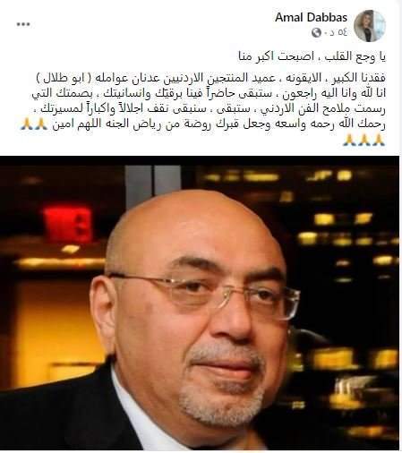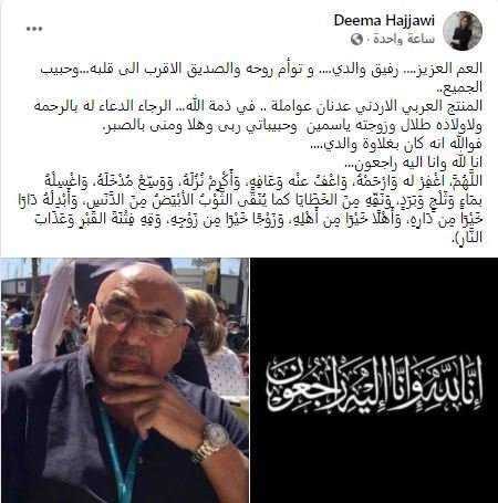 وكتبت الشيف ديما حجاوي عبر حسابها على فيس بوك :"العم العزيز.... رفيق والدي.... و توأم روحه والصديق الاقرب الى قلبه...وحبيب الجميع.. المنتج العربي الاردني عدنان عواملة .. في ذمة الله... الرجاء الدعاء له بالرحمه ولاولاده طلال وزوجته ياسمين وحبيباتي ربى وهلا ومنى بالصبر.. فوالله انه كان بغلاوة والدي....انا لله وانا اليه راجعون"