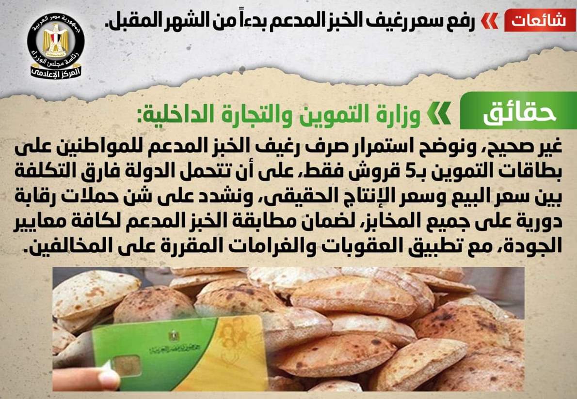وتواصل المركز الإعلامي لمجلس الوزراء مع وزارة التموين والتجارة الداخلية، والتي نفت تلك الأنباء، مُؤكدةً أنه لا صحة لرفع سعر رغيف الخبز المدعم بدءاً من الشهر المقبل.