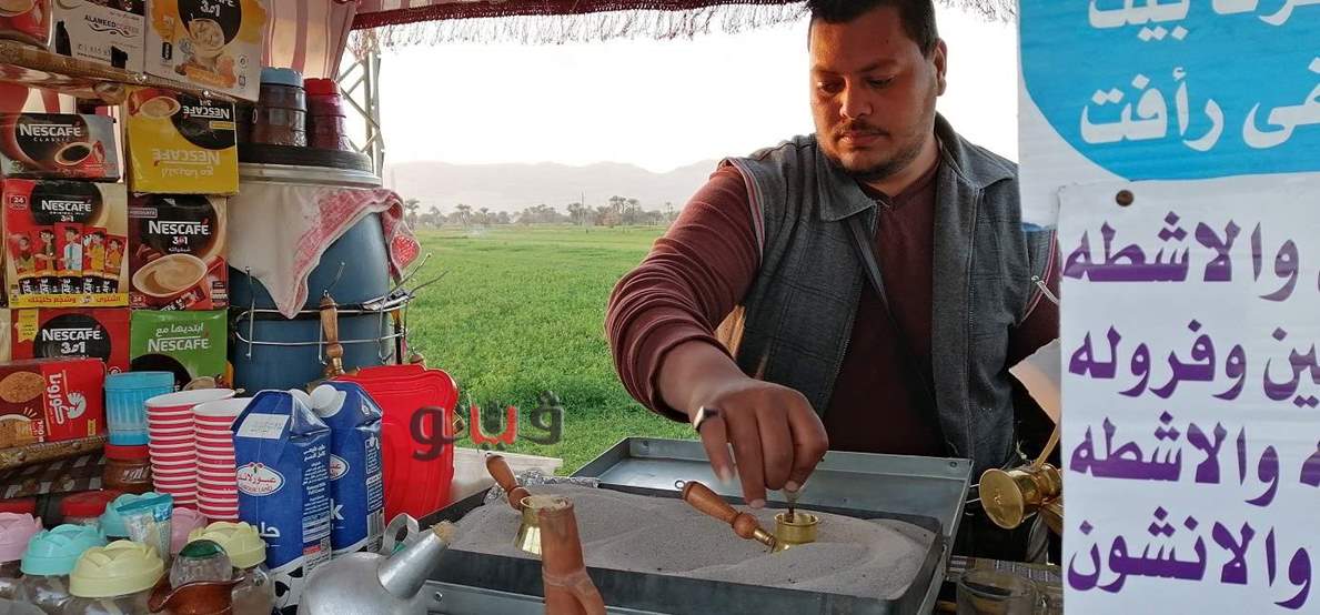 "فيتو" التقت الشاب مصطفى محمد رأفت، يعمل فني تبريد وتكييف، ويصنع القهوة على الرملة في كافيه متنقل لأول مرة في محافظة قنا.