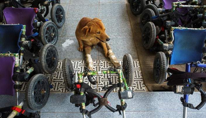 والكلاب المعاقة لا يمكنها الحركة بدون عجلات ويتم تثبيتها مكان الساقين الخلفيتين.