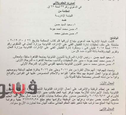 أصدرت المحكمة التأديبية العليا بمجلس الدولة حكمها في القضية رقم 32 لسنة 62 قضائية عليا بمجازاة رئيس الإدارة المركزية للشئون القانونية بجامعة القاهرة، ومدير الشئون القانونية بالمعهد القومي للأورام بعد ثبوت ارتكابهما مخالفات مالية وإدارية وقانونية، وبراءة مدير عام التحقيقات والتأديب بالجامعة.