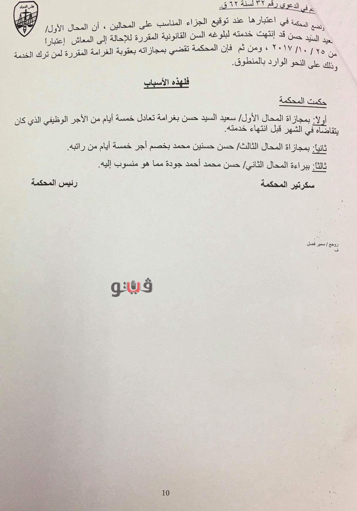 وقضت بتغريم سعيد السيد حسن، رئيس الإدارة المركزية للشئون القانونية بما يعادل خمسة أيام من أجره الوظيفي عند إحالته للمعاش لتقاعسه عن إحكام الرقابة والإشراف على أعمال الإدارات القانونية التابعة للإدارة رئاسته حينما توافر لديه العلم بصدور حكم محكمة الجنايات ضد آمال حلمي عبد الحليم بالسجن المشدد 5 سنوات وعزلها من الوظيفة وإلزامها بدفع 263 ألف جنيه وغرامة مساوية لهذا المبلغ مما ترتب عليه تأخير تنفيذ الحكم.