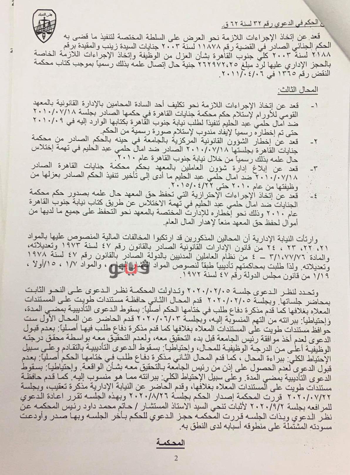 وانتهت المحكمة إلى براءة حسن محمد أحمد، مدير عام التحقيقات والتأديب بالجامعة لعدم ارتكابه ثمة مخالفة بشأن إجراءات العرض على السلطة المختصة لتنفيذ الحكم بشأن العزل من الوظيفة والحجز الإداري على المتهمة لرد المبلغ المقضي به.