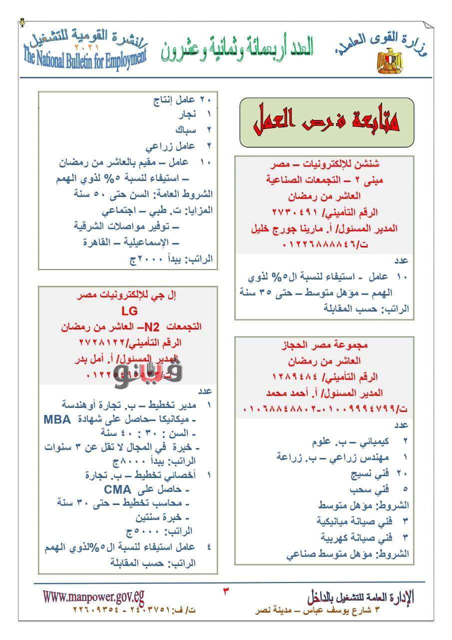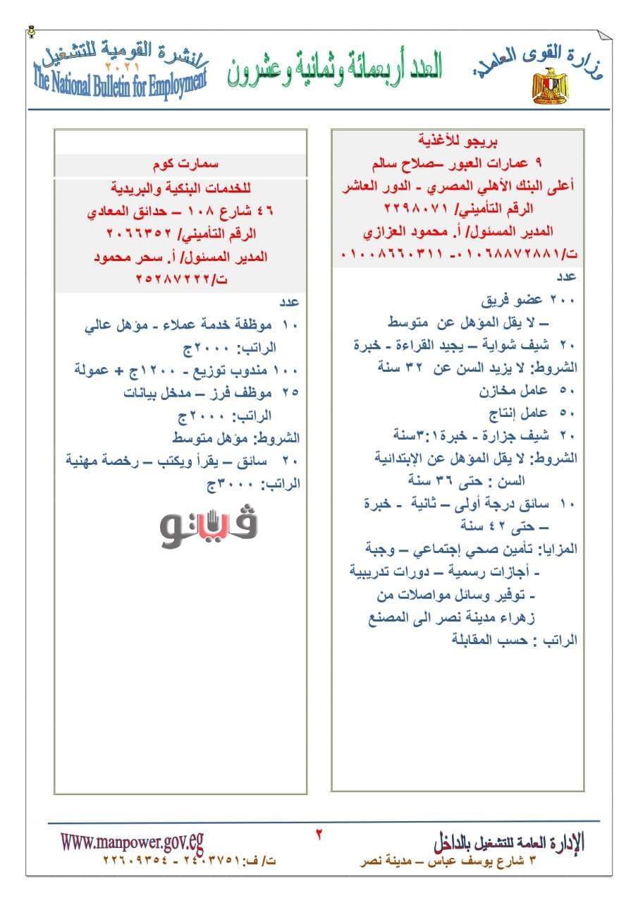 وفي البحيرة توجد فرص عمل لـ 35 عامل خياطة ، و 10 عامل مخازن براتب 1900 جنيه بمنشآت القطاع الخاص بالمحافظة، وفي المنيا 200 عامل خياطة ، و 200 فرد أمن ، و20 منسقة ميدانية للعمل فى قرى المحافظة براتب 2000 جنيه ، ومندوب مبيعات ،وسائق لوري وتريلا ، وأخصائي إئتمان ، ومحاسبين ، وموظفين إداريين .