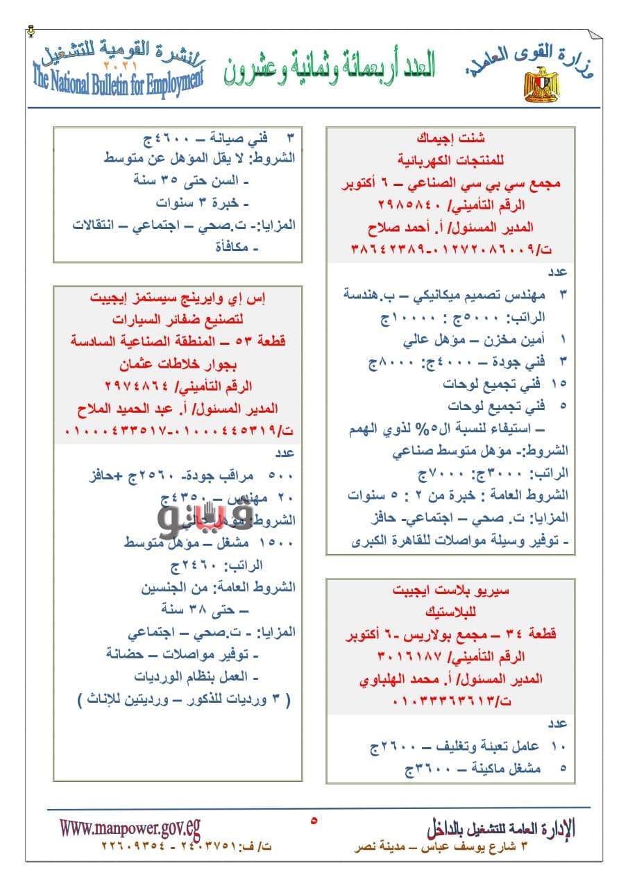 ولفت سعفان إلي أن فرص العمل المتوفرة بالقاهرة تشمل 100 مندوب توزيع و500 مراقب جودة ، و1500 مشغل ، و 21 مهندس براتب يصل لـ 4350 جنيها ، و 3 مهندس ميكانيكي براتب يبدأ من 5 آلاف جنيه وحتى 8 آلاف جنيه ، و 3 فنى جودة براتب بصل لـ 6 آلاف جنيه بمصنع بمنطقة 6 أكتوبر بمجمع سي بي سي الصناعي .
