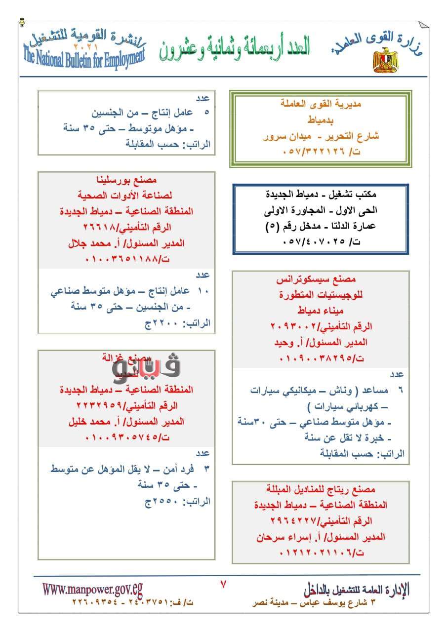 وفي دمياط يوجد 24 فرصة عمل متاحة ، منها : 6 مساعد فني ، و 15 عامل إنتاج ، و 3 فرد أمن .