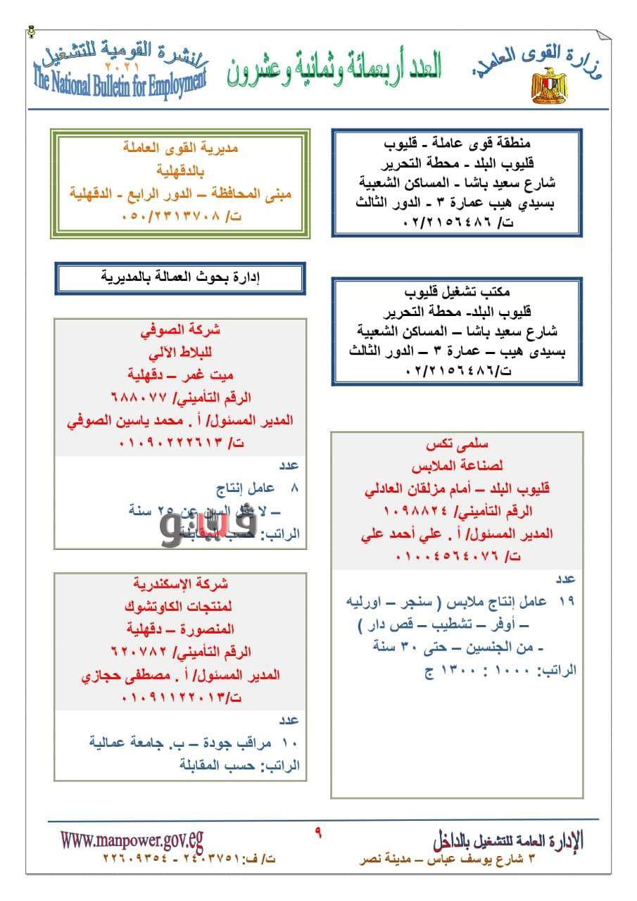 وفي بالدقهلية يوجد 148 فرصة عمل من خلال النشرة متاحة لشغلها ، فى تخصصات مختلفة منها : 24 عامل إنتاج ، و 10 مراقب جودة ، و 7 مندوب مبيعات براتب يصل لـ 3600 جنيه ، و5 محصل ، و 4 سائق براتب 3500 جنيه ، و 2 مراجع ميداني ، و 33 عامل خدمات معاونة ، و 8 عمال عاديين ، و 9 عمال خياطة ، و 16 بائع ، وفرد أمن .