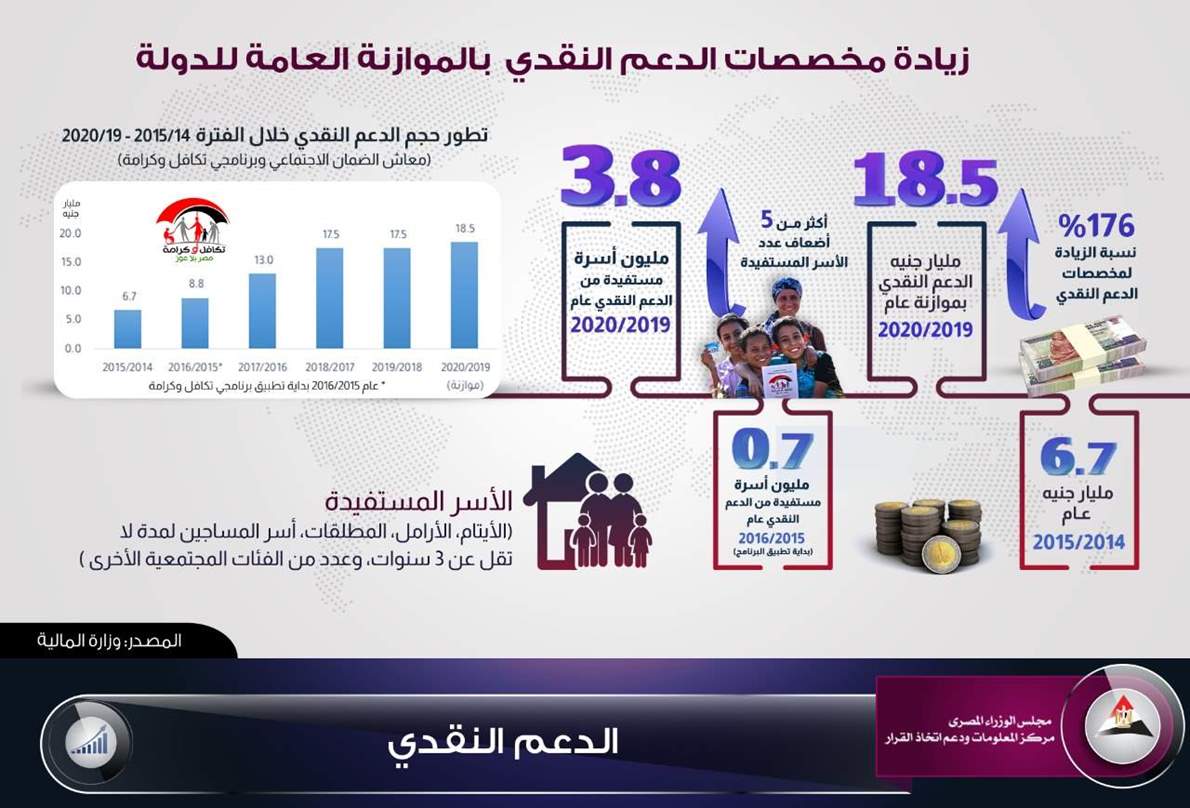 وشهدت الموازنة العامة للدولة زيادة في مخصصات الدعم النقدي للعام المالي 2020/2019، بإجمالي 18.5 مليار جنيه؛ وتطبيق برنامجي تكافل وكرامة وزيادة معاش الضمان الاجتماعي على مدار 6 سنوات، ووصل عدد المستفيدين منها إلى نحو 3.8 ملايين أسرة مستفيدة من الدعم النقدي خلال عام 2020/2019.