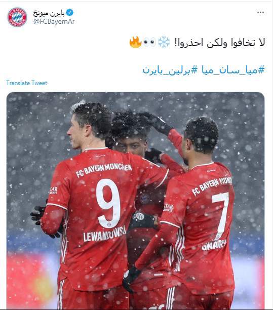 وكتب نادي بايرن ميونخ تغريدة على تويتر قال: "لا تخافوا ولكن احذروا!.. #ميا_سان_ميا #برلين_بايرن".