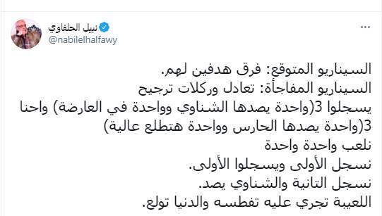 وكتب نبيل الحلفاوي تغريدة على تويتر "السيناريو المتوقع: فرق هدفين لهم.. السيناريو المفاجأة: تعادل وركلات ترجيح يسجلوا 3 (واحدة يصدها الشناوي وواحدة في العارضة) واحنا 3(واحدة يصدها الحارس وواحدة هتطلع عالية) نلعب واحدة واحدة نسجل الأولى ويسجلوا الأولى.. نسجل التانية والشناوي يصد.. اللعيبة تجري عليه تفطسه والدنيا تولع".