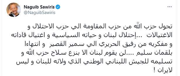وكتب نجيب ساويرس تغريدة على تويتر قال فيها: "تحول حزب الله من حزب المقاومة إلى حزب الاحتلال والاغتيالات.. احتلال لبنان وحياته السياسية واغتيال قادته ومفكريه من رفيق الحريري إلى سمير القصير وانتهاء بلقمان سليم.. لن يقوم لبنان إلا بنزع سلاح حزب الله وتسليمه للجيش اللبناني الوطني الذي ولائه للبنان وليس لإيران".