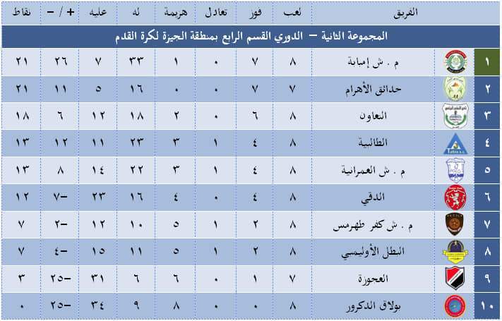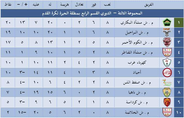 أعلنت لجنة مسابقات القسم الرابع بمنطقة الجيزة جدول ترتيب المجموعات الثلاثة بالمسابقة بعد إنتهاء الجولة الثامنة.
