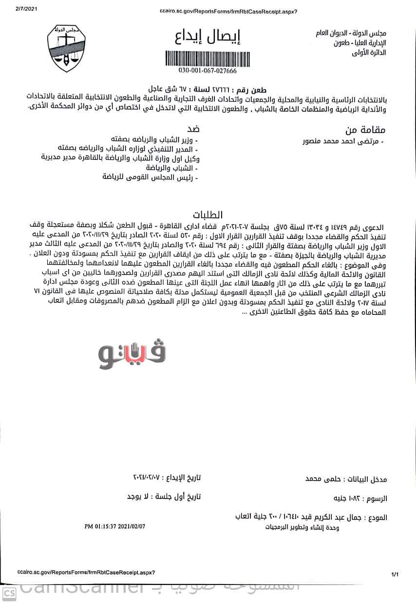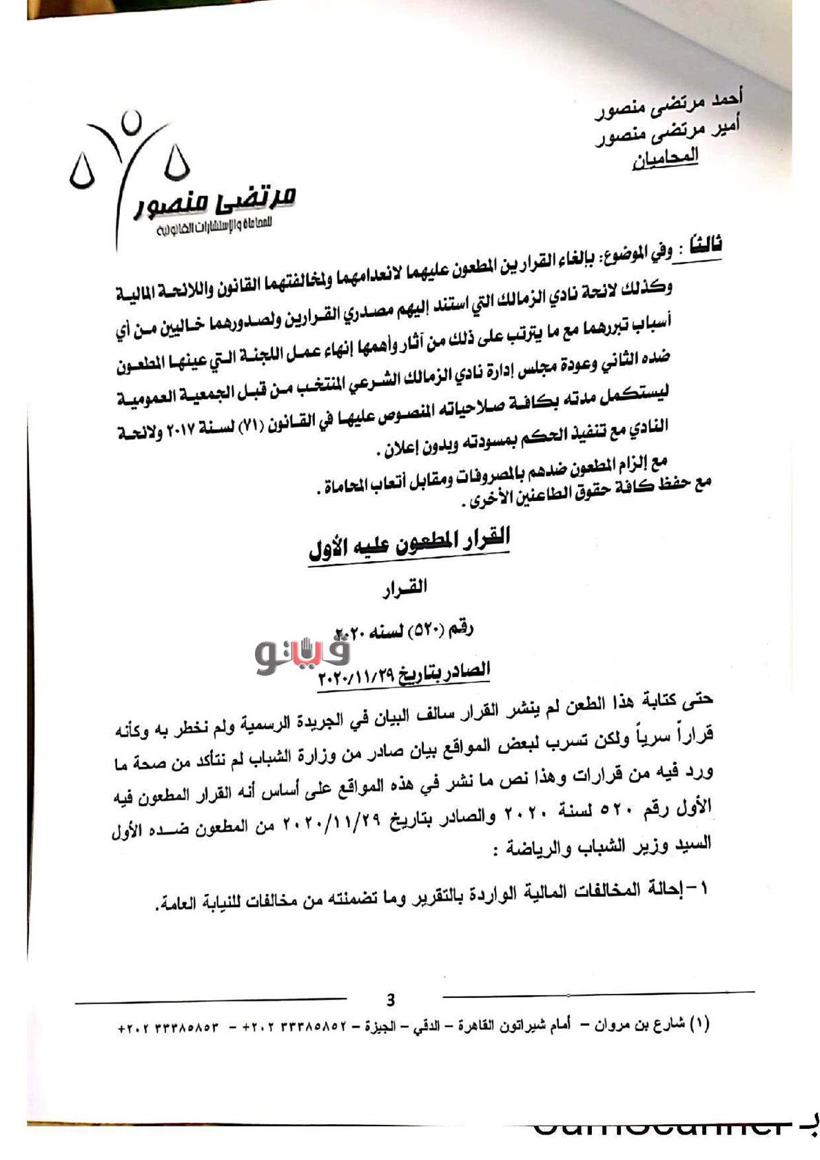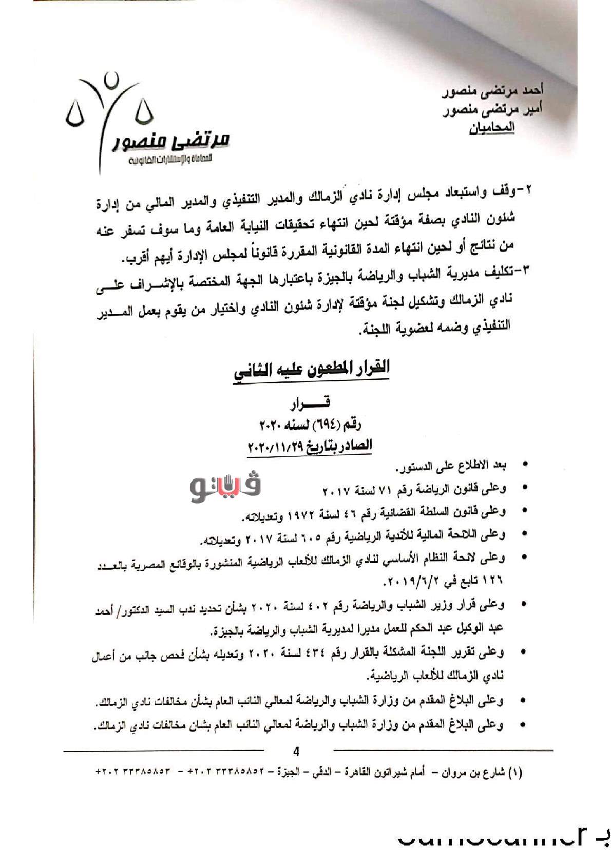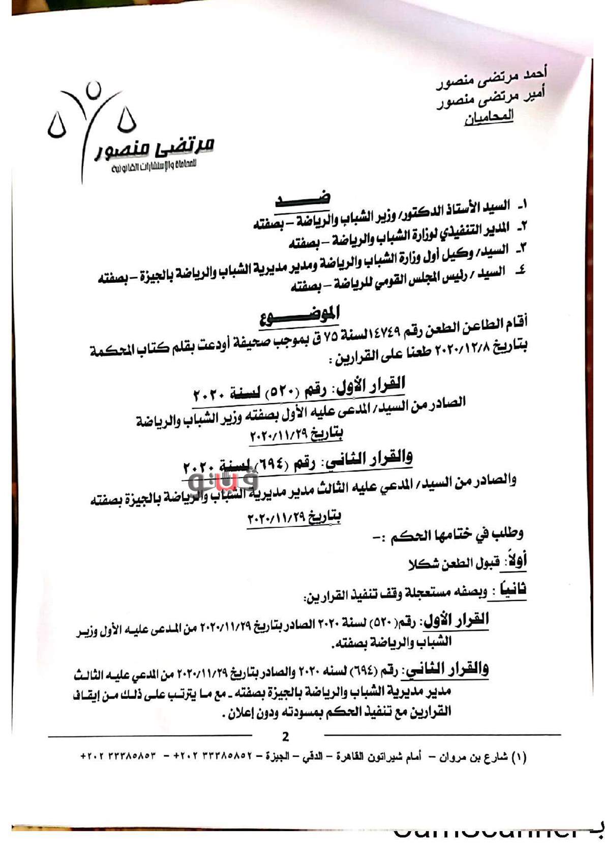 كما طالبت الدعوى، بإلغاء قرار مديرية الشباب والرياضة رقم 694 بتاريخ 29 نوفمبر 2020 متضمناً في مادته الأولى تشكيل لجنة مؤقتة لإدارة وتسيير أعمال نادي الزمالك للألعاب الرياضية تضم ثلاثة أعضاء.