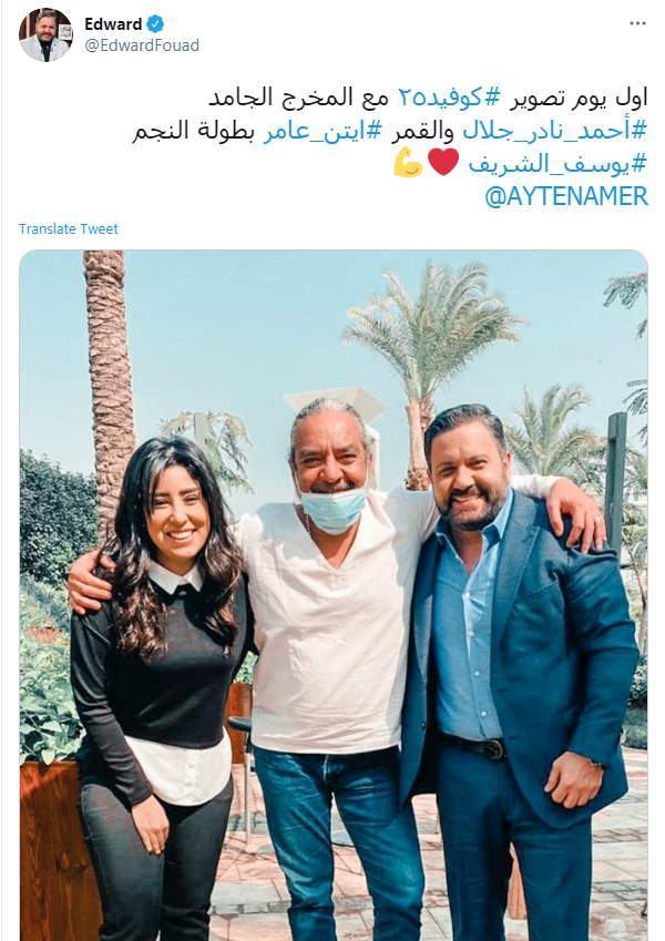 وكتب إدوارد تغريدة على تويتر قال فيها: "اول يوم تصوير #كوفيد٢٥ مع المخرج الجامد #أحمد_نادر_جلال والقمر #ايتن_عامر بطولة النجم #يوسف_الشريف".