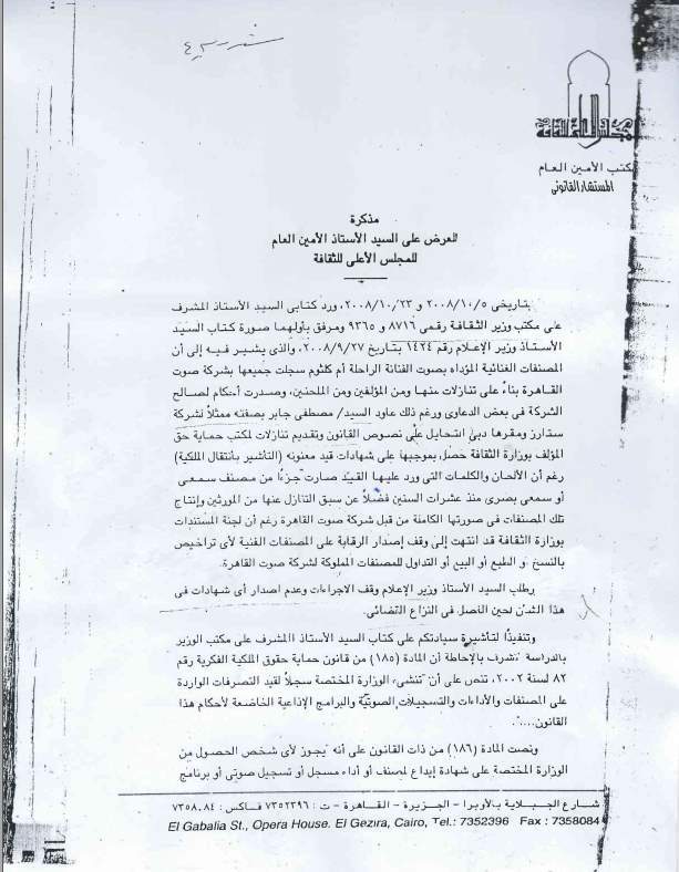 وتابع: "أما موضوع شهادات القيد فإن صوت القاهرة تغير الحقيقة وتحاول بشتى الطرق أن تلقي التهم على المسئولين فى وزارة الثقافة حتى يقوموا بالغاء شهادات القيد الخاصة بنا وادعوا أن الشئون القانونية فى الوزارة أكدت صحة مستندات صوت القاهرة، وهو ادعاء غير صحيح فقد سبق لصوت القاهرة عن طريق وزير الإعلام صفوت الشريف القيام بهذه المحاولة عدة مرات وقد رد المستشار القانونى لوزارة الثقافة محمد لطفى على ذلك، وكتب تقريراً رسمياً أكد فيه أحقية شركتنا ستارز فى شهادات القيد وليس صوت القاهرة".
