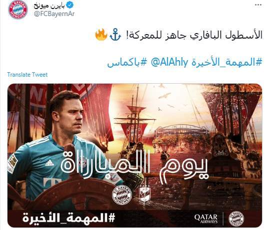 وكتب نادي بايرن ميونخ تغريدة على "تويتر": "الأسطول البافاري جاهز للمعركة! #المهمة_الأخيرة @AlAhly #باكماس".