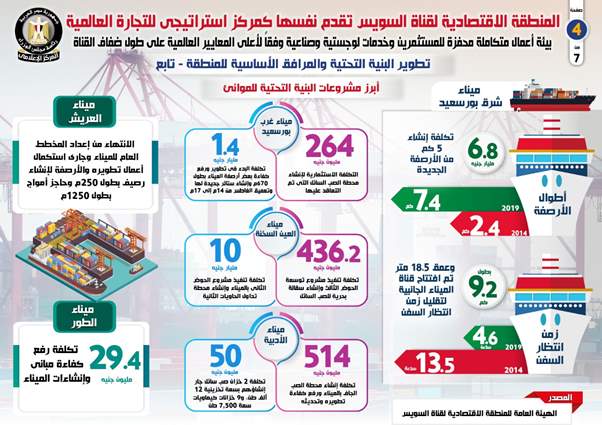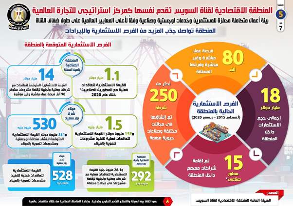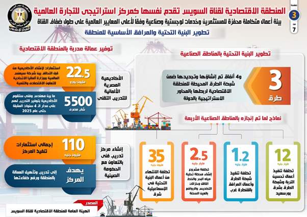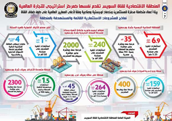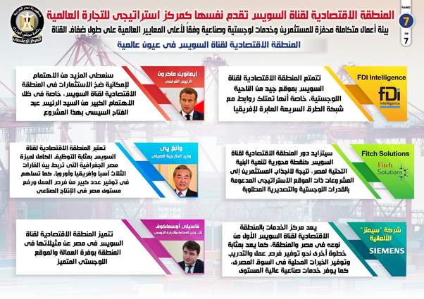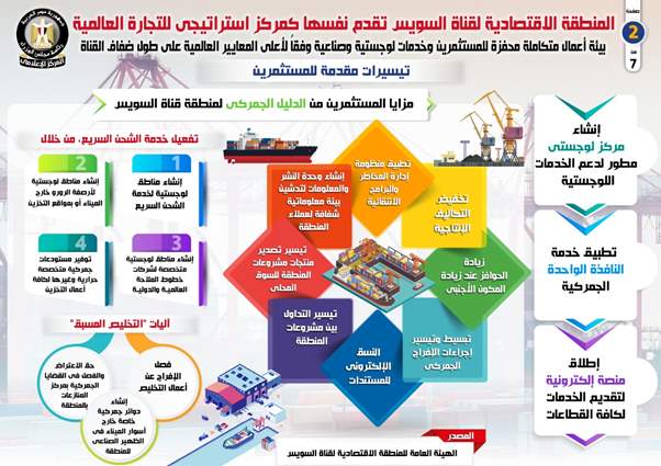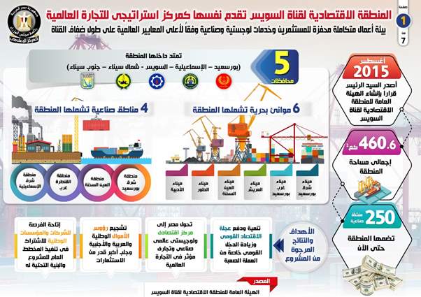 وفي هذا الصدد، نشر المركز الإعلامي لمجلس الوزراء، تقريراً تضمن إنفوجرافات تسلط الضوء على جهود تحويل المنطقة الاقتصادية لقناة السويس إلى مركز استراتيجي للتجارة العالمية.