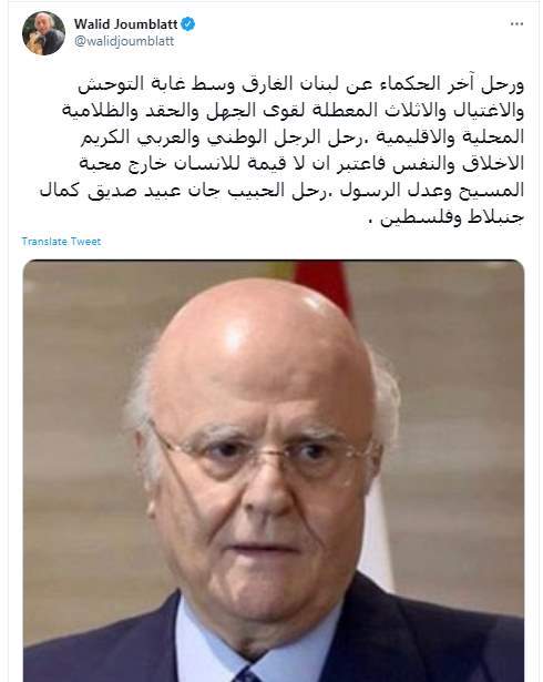 وكتب وليد جنبلاط تغريدة على تويتر قال فيها: "ورحل آخر الحكماء عن لبنان الغارق وسط غابة التوحش والاغتيال والاثلاث المعطلة لقوى الجهل والحقد والظلامية المحلية والاقليمية".