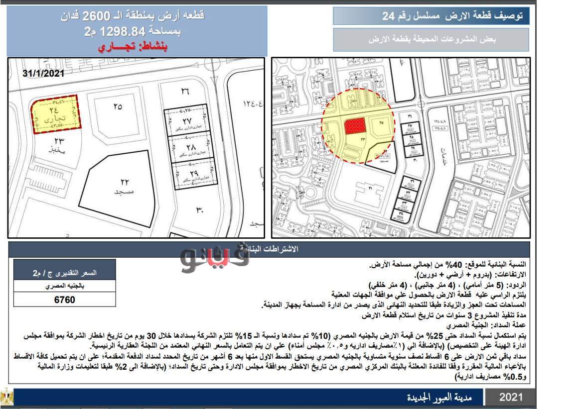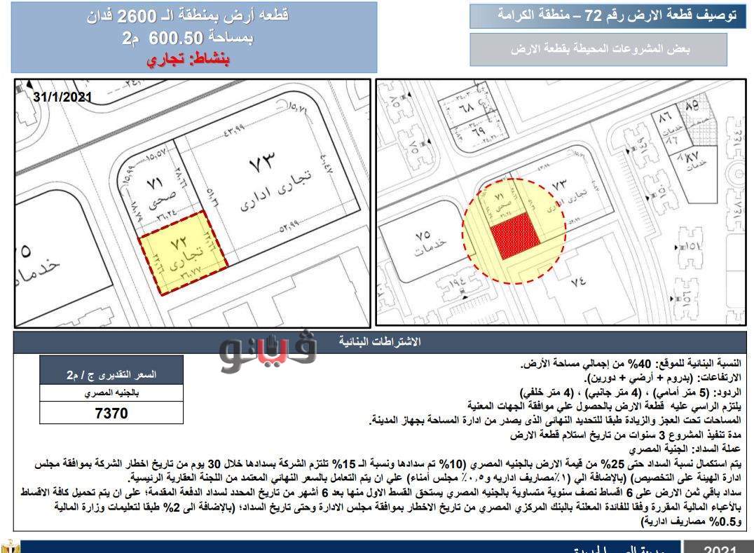 وتطرح بمدينة العبور الجديدة أرضا بمساحة 6598 مترا بنشاط تعليمي بسعر 4065 جنيها للمتر، وأرضا بنشاط تجاري بمساحة 600 متر بسعر 7370 جنيها للمتر، وأرضا بمساحة 1298 مترا بنشاط تجاري بسعر 6760 جنيها.