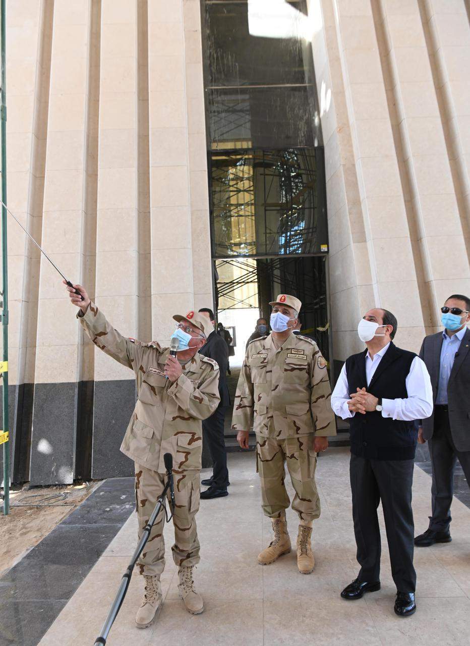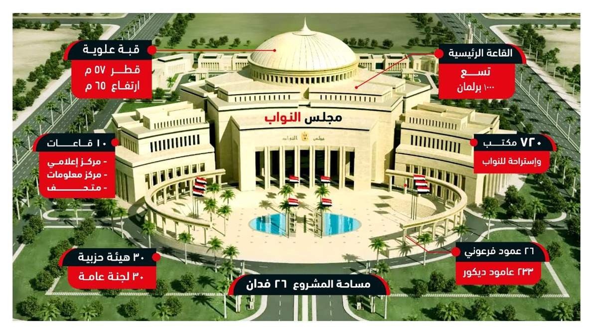 وقال السفير بسام راضي المتحدث باسم رئاسة الجمهورية إن الرئيس تفقد أيضا مبنى مجلس النواب البرلمان بالعاصمة الإدارية، وهو الأكبر في الشرق الأوسط حيث تسع القاعة الرئيسية لاستيعاب ١٠٠٠ عضو بمسطح ٣ أضعاف المبنى الحالي للبرلمان بالقاهرة، وملحق بالقاعة الرئيسية مجموعة مبانٍ خدمية منفصلة تشمل دور عبادة، ومركز طبي، ومبنى للشرطة، ووحدة إطفاء وسجل مدني، وقاعات استماع، ومركز إعلامي، ومركز معلومات، ومركز تدريب، بالإضافة إلى المسطحات الخضراء. كما تعلوا القاعة الرئيسية قبة وسطية تعد من أكبر القباب التي تم تنفيذها على مستوى العالم.