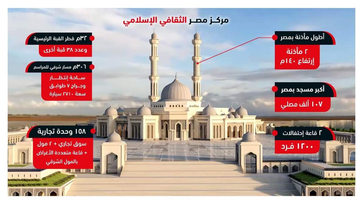 واطلع الرئيس على الموقف التنفيذي والإنشائي لعدد من الأحياء والمنشآت منها مركز مصر الثقافي الإسلامي الذي يحتوي على أحد أكبر المساجد في العالم هو مسجد مصر بسعة مصلين ۱۰۷ ألف مصلٍ وترتفع مآذنه بطول ١٤٠ مترا، ويتضمن مجموعة من القاعات الضخمة للاحتفالات والمناسبات وتحفيظ قرآن للرجال والسيدات والأطفال كما يحتوي على ساحة انتظار للسيارات وجراج متعدد الأدوار (۷ أدوار) بسعة إجمالية ٣٠٠٠ سيارة.