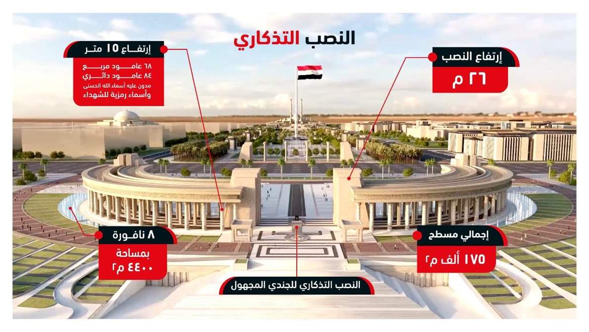 كما اطلع الرئيس كذلك على ساحة الشعب التي بها أعلى وأضخم ساري علم في العالم وكذلك النصب التذكاري الذي صمم بطابع فرعوني من حيث استخدام الأعمدة والزخارف ويتكون من جزأين على الشكل الدائري مدون عليهم أسماء شهداء مصر على مر العصور.