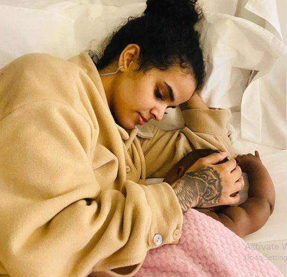 وفي الصورة تظهر رهف مستلقية على السرير بجانب طفلتها الرضيعة، واضعة يدها على رأس صغيرتها.