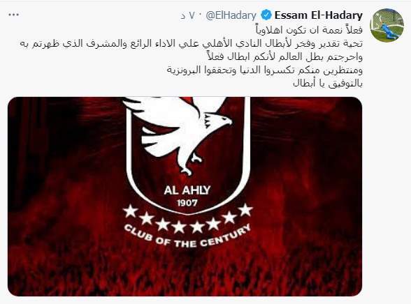 وكتب الحضري، عبر صفحته الشخصية على موقع التدوينات القصيرة "تويتر": "فعلاً نعمة أن تكون أهلاوياً.. تحية تقدير وفخر لأبطال النادي الأهلي علي الأداء الرائع والمشرف الذي ظهرتم به وأحرجتم بطل العالم لأنكم أبطال فعلاً.. ومنتظرين منكم تكسروا الدنيا وتحققوا البرونزية.. بالتوفيق يا أبطال".