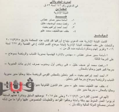 تأديب مدير الشباب والرياضة بسوهاج ومندوب الصرف وبراءة آخرين