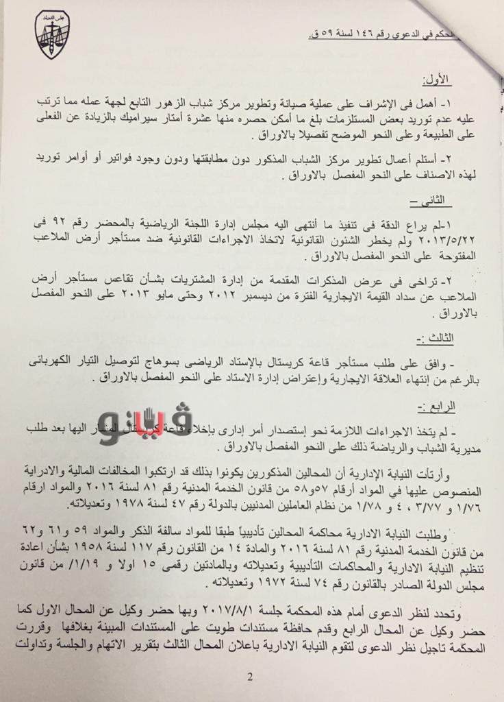 وقضت المحكمة أيضًا بتغريم رفعت محمد أبو ضيف، مندوب صرف إداري بغرامة تعادل الأجر الأساسي الذي كان يتقاضاه في الشهر عند إنتهاء خدمته، لعدم مراعاته الدقة في تنفيذ ما انتهى إليه مجلس إدارة اللجنة الرياضية وتقاعس عن إخطار الشئون القانونية ضد مستأجر أرض الملاعب المفتوحة وتراخى في عرض المذكرات المقدمة من إدارة المشتريات بشأن تقاعس مستأجر أرض الملاعب بشأن سداد القيمة الإيجارية