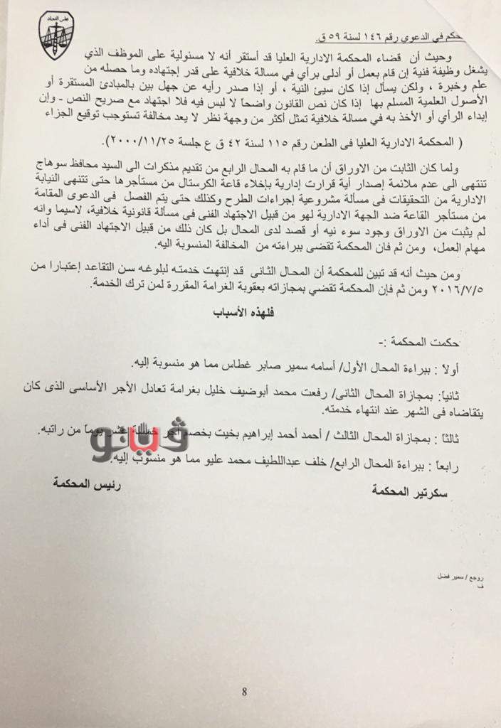 كما قضت المحكمة ببراءة خلف عبد اللطيف محمد، مدير عام الشئون القانونية بديوان عام محافظة سوهاج بعد ثبوت عدم صحة ما نسبته اليه النيابة الإدارية عبر التحقيقات بشأن عدم إتخاذه الإجراءات اللازمة نحو استصدار أمر إداري بإخلاء قاعة كريستال بعد طلب مديرية الشباب والرياضة، لعدم ثبوت إرتكابه ثمة مخالفات