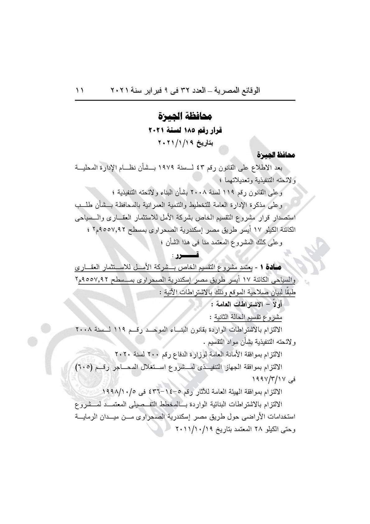 نشرت جريدة الوقائع المصرية في عددها رقم 32، الصادر في 9 فبراير 2021، قرار محافظة الجيزة رقم 185 لسنة 2021، بشأن اعتماد مشروع التقسيم الخاص بشركة الأمل للاستثمار العقارى والسياحى طريق مصر إسكندرية الصحراوى.