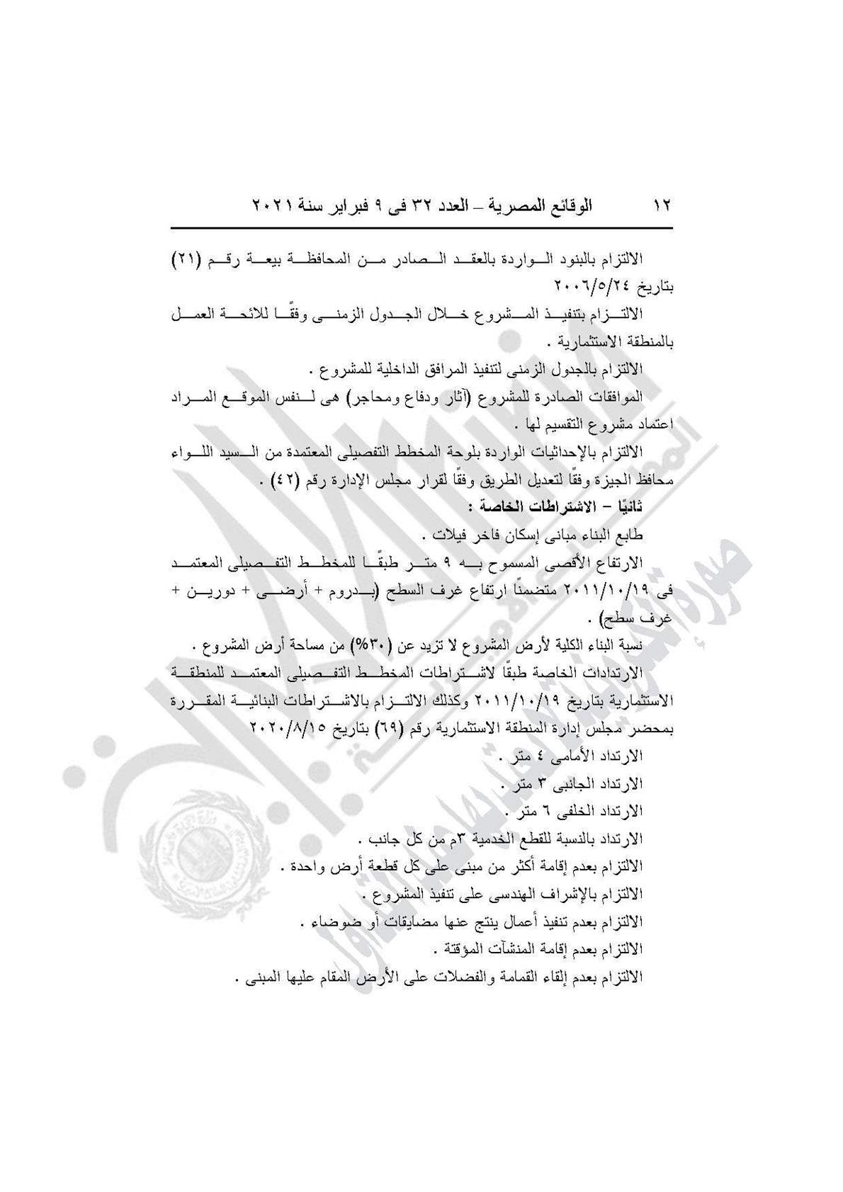والالتزام بالبنود الواردة بالعقد الصادر من المحافظة بيعة رقم (21) بتاريخ 24/5/2006، والالتزام بتنفيذ المشروع خلال الجدول الزمنى وفقًا للائحة العمل بالمنطقة الاستثمارية. مع الالتزام بالجدول الزمنى لتنفيذ المرافق الداخلية للمشروع . والموافقات الصادرة للمشروع (آثار ودفاع ومحاجر) هى لنفس الموقع المراد اعتماد مشروع التقسيم لها . الالتزام بالإحداثيات الواردة بلوحة المخطط التفصيلى المعتمدة من السيد اللواء محافظ الجيزة وفقًا لتعديل الطريق وفقًا لقرار مجلس الإدارة رقم (42).