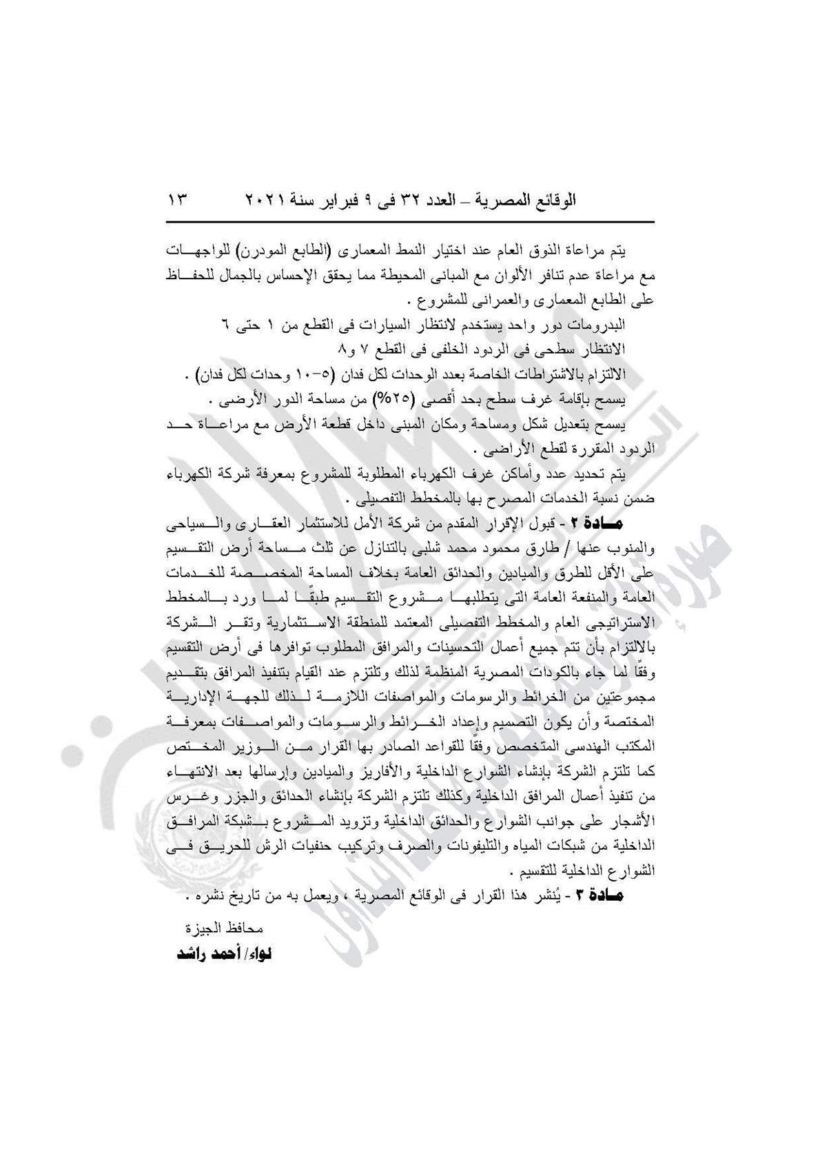 وينص القرار في مـادته الأولى على اعتماد مشروع التقسيم الخاص بشركة الأمل للاستثمار العقارى والسياحى الكائنة 17 أيسر طريق مصر إسكندرية الصحراوى بمسطح 9557.92 متر مربع، طبقًا لبيان صلاحية الموقع.
