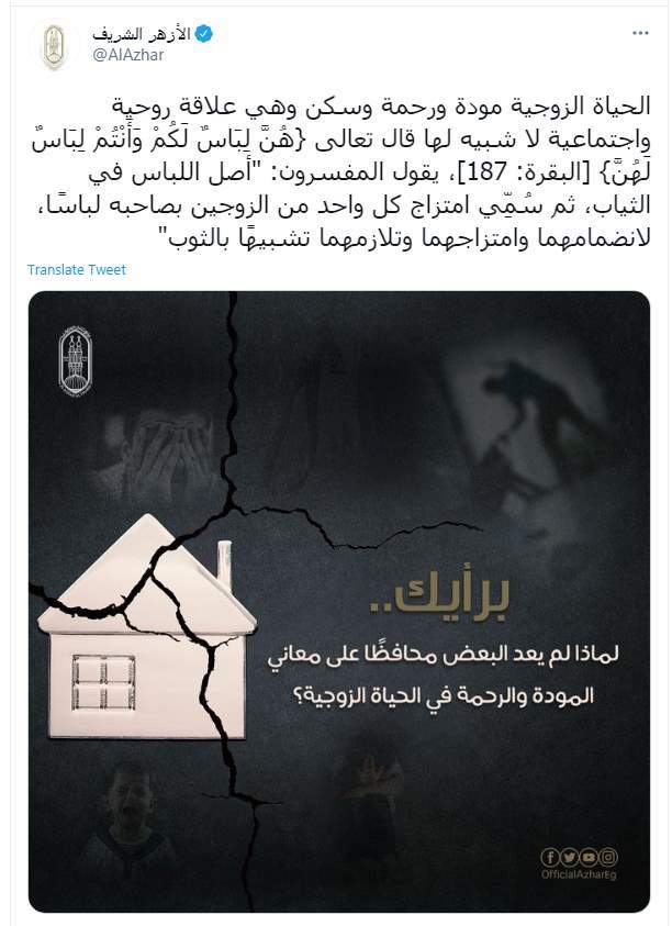 وكتب الأزهر الشريف تغريدة على تويتر "الحياة الزوجية مودة ورحمة وسكن وهي علاقة روحية واجتماعية لا شبيه لها قال تعالى {هُنَّ لِبَاسٌ لَكُمْ وَأَنْتُمْ لِبَاسٌ لَهُنَّ} [البقرة: 187]